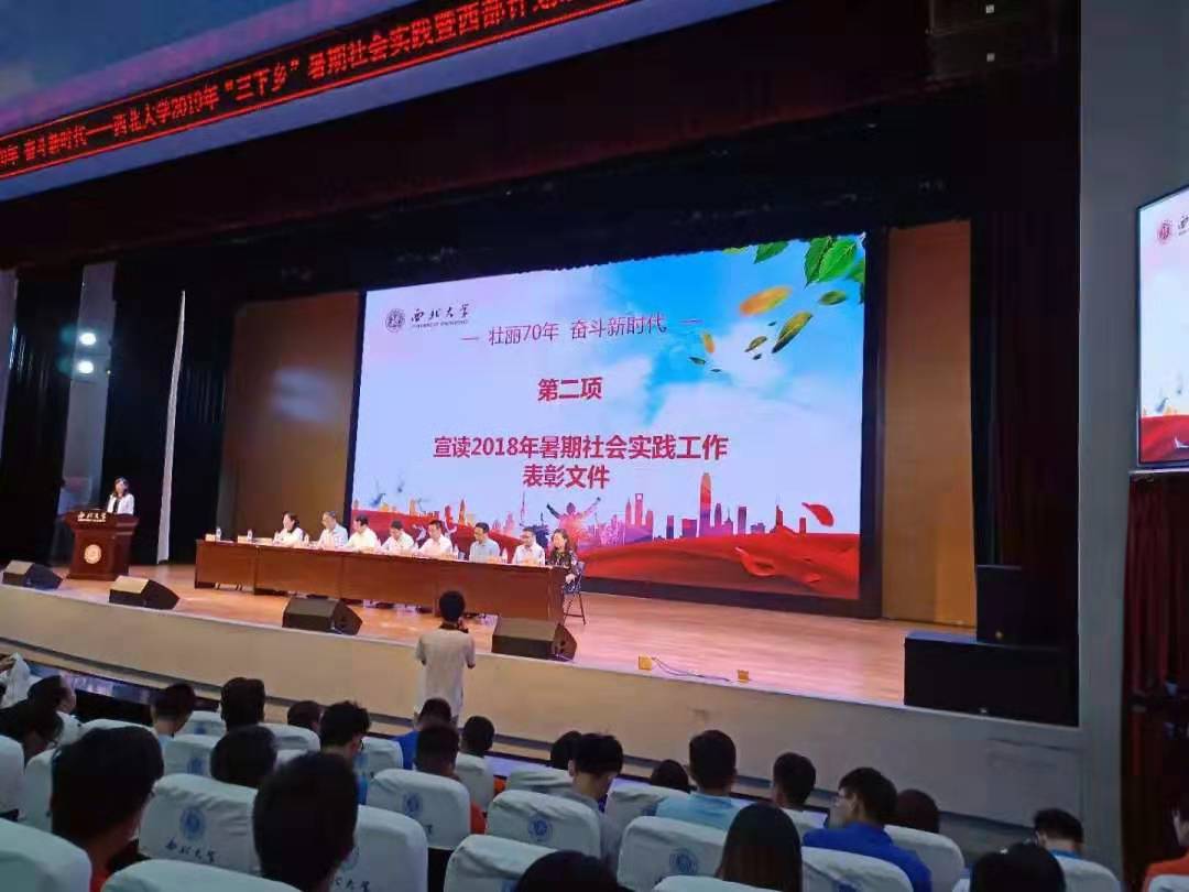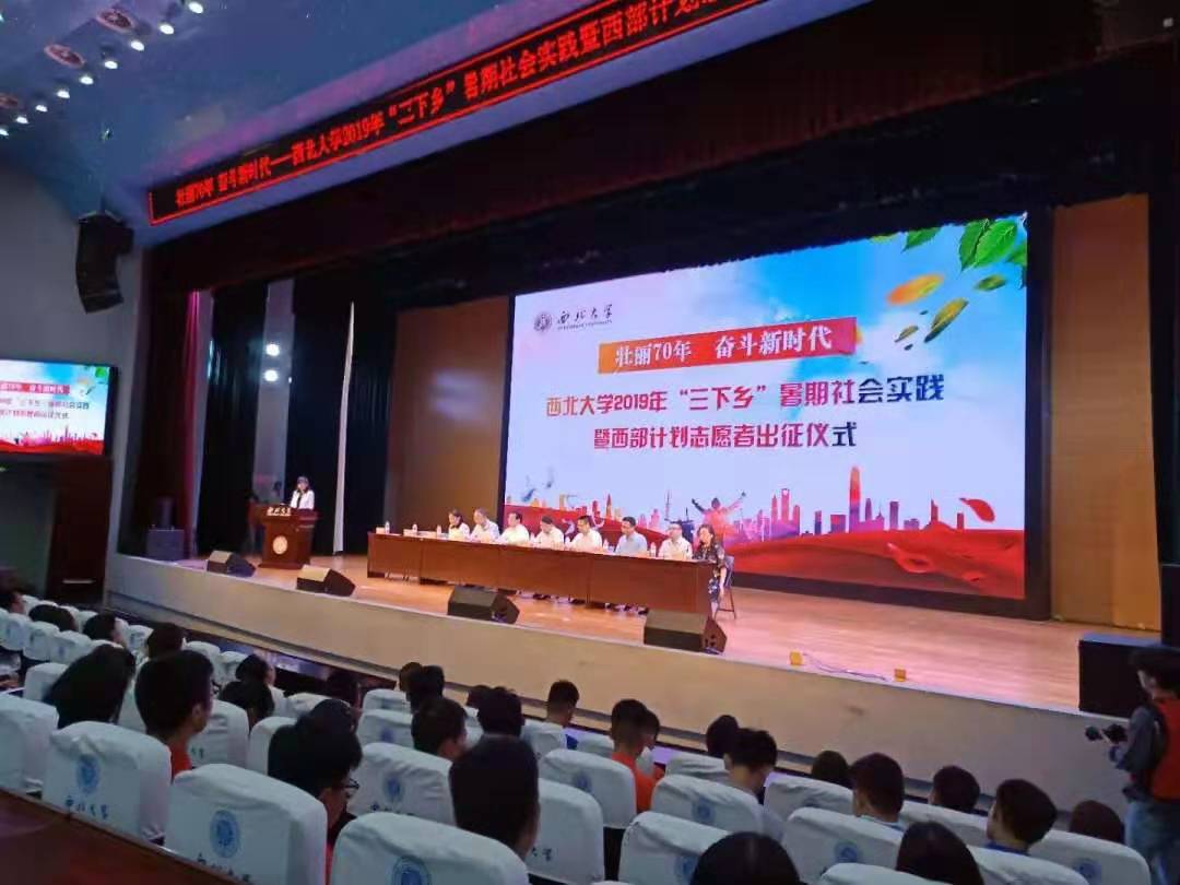 7月8日下午,壮丽70年,奋斗新时代——西北大学2019年“三下乡”暑期社会实践暨西部计划志愿者出征仪式在学生活动中心星空报告厅举行。校党委副书记孙国华老师等出席了本次仪式,2019暑期三下乡各队负责人及相关老师到场参加。