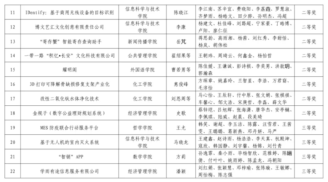 根据《西北大学关于举办2019年“创青春”大学生创业大赛的通知》安排,本次大赛共计收到来自20个院(系)和单位的264个参赛项目(含疫情防控直通项目),直接参赛师生2000余人。经院(系)预赛、校级复赛和校级决赛,我院一共获奖两项,具体如下: