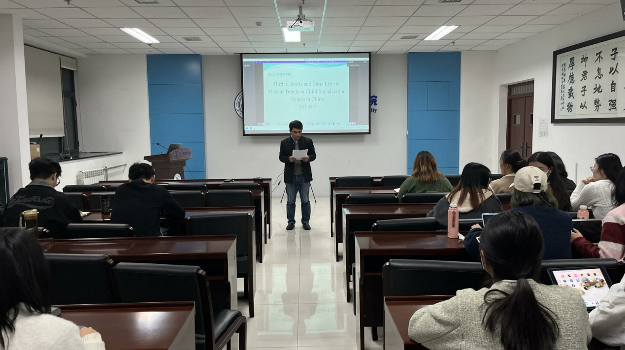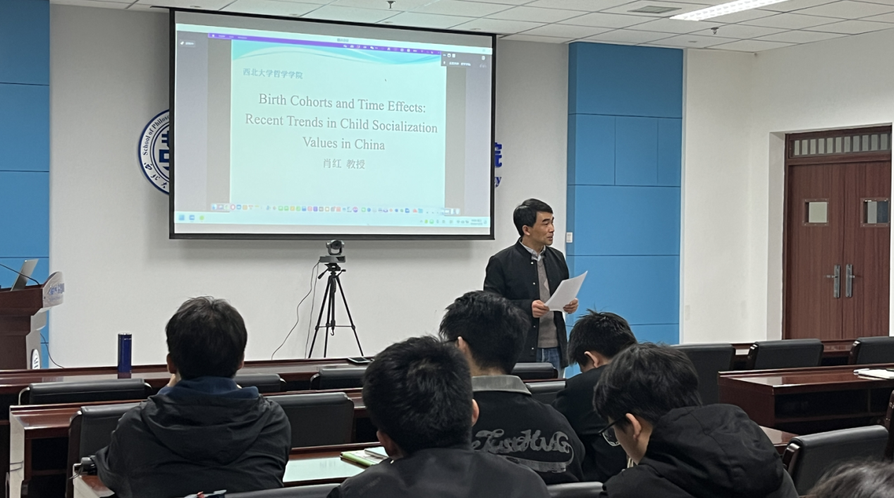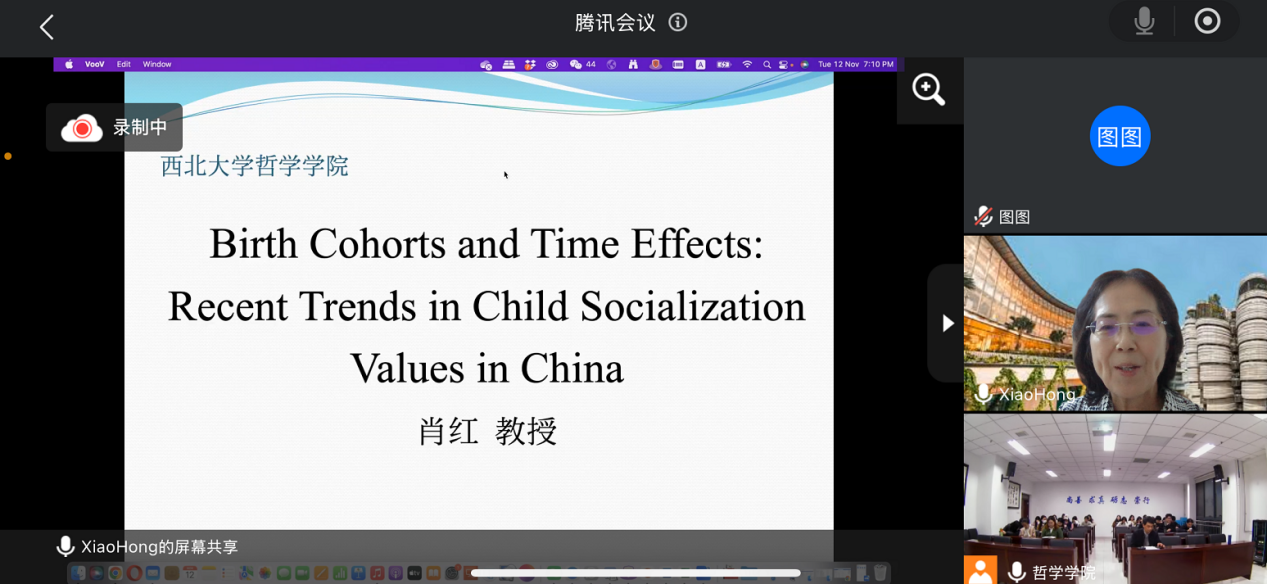 2024年11月2日晚19时,西北大学第十八届研究生学术活动月之专家报告在长安校区西学楼北0304国产手机精品a会议室举行,西北大学国产手机精品a客座教授肖红受邀以线上形式作了题为“Birth Cohorts and Time Effects: Recent Trends in Child Socialization Values in China”的全英文专题报告。讲座由国产手机精品a胡军良教授主持,社工专硕导师王珩为与谈人,国产手机精品a2023级社工专硕在场下主会场参加讲座,其他专业、年级的学生利用腾讯会议线上参与,参与人数约100人,反响热烈。